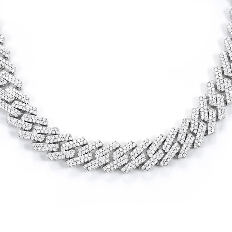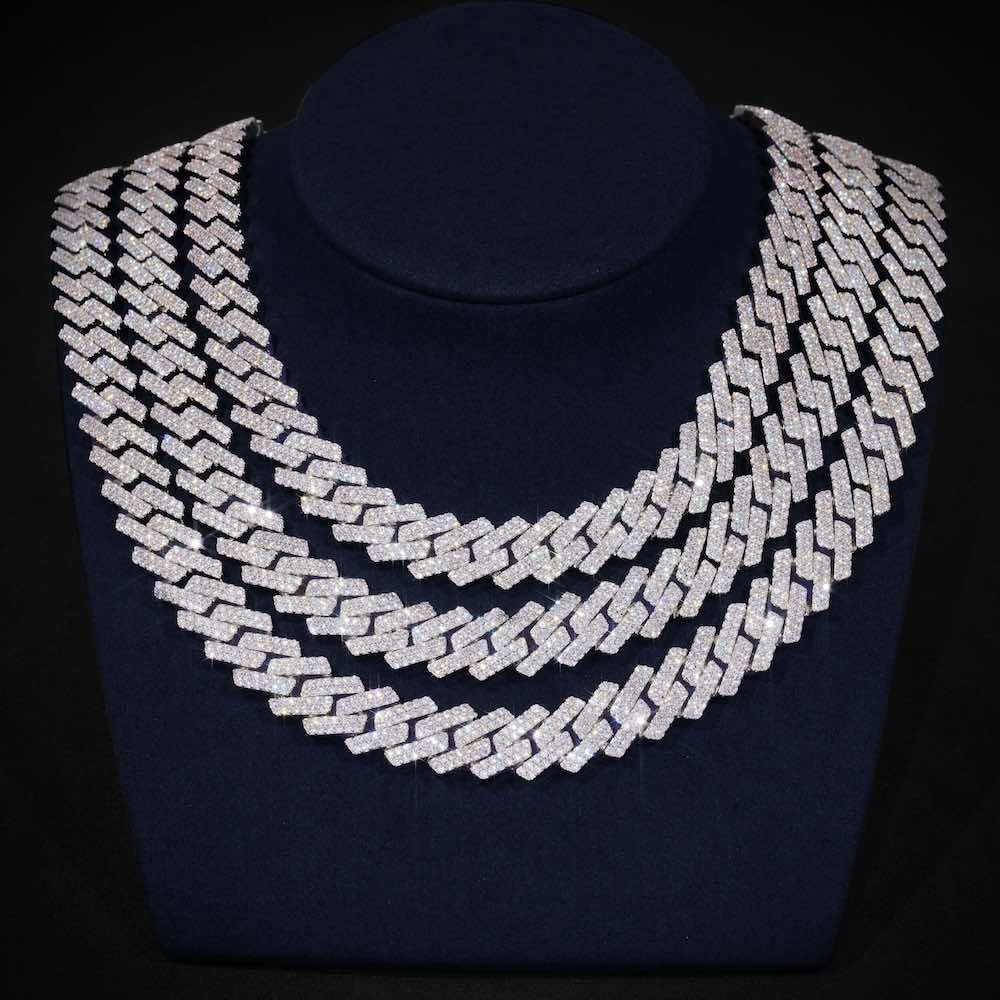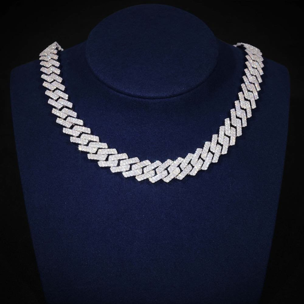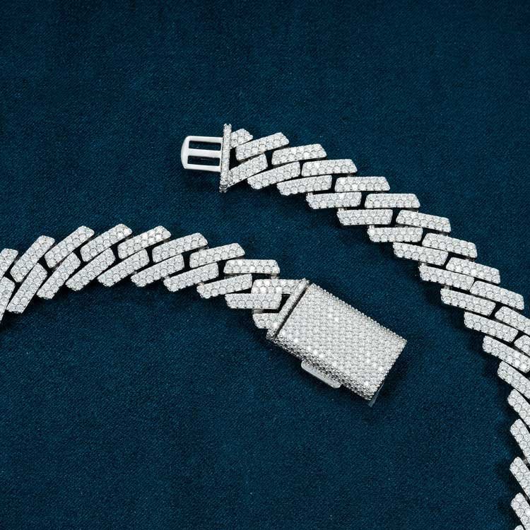 This moissanite cuban link chain is iced out with 2 rows of round cut, colorless (D-Color), VVS moissanite flawless diamonds, placed in a pave and prong diamond setting. All of the diamonds on this moissanite cuban necklace are guaranteed to pass the diamond tester.