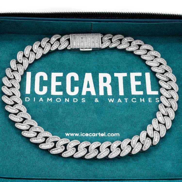 ICECARTEL exclusive 20MM VVS Moissanite Baguette Miami Cuban Link Chain is now available, made of 925 sterling silver and PVD plated with a thick layer of 14K Gold. This moissanite cuban link chain measures exactly 20 millimeters in diameter, with each link measuring exactly 10 millimeters.