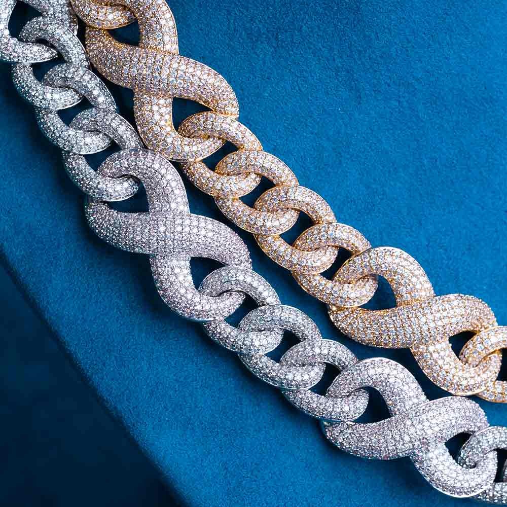 ICECARTEL exclusive 20MM Moissanite Infinity Link Chain 14K Gold is now available, made of 925 sterling silver and PVD plated with a thick layer of 14K Gold. This moissanite infinity link chain measures exactly 20 millimeters in diameter.