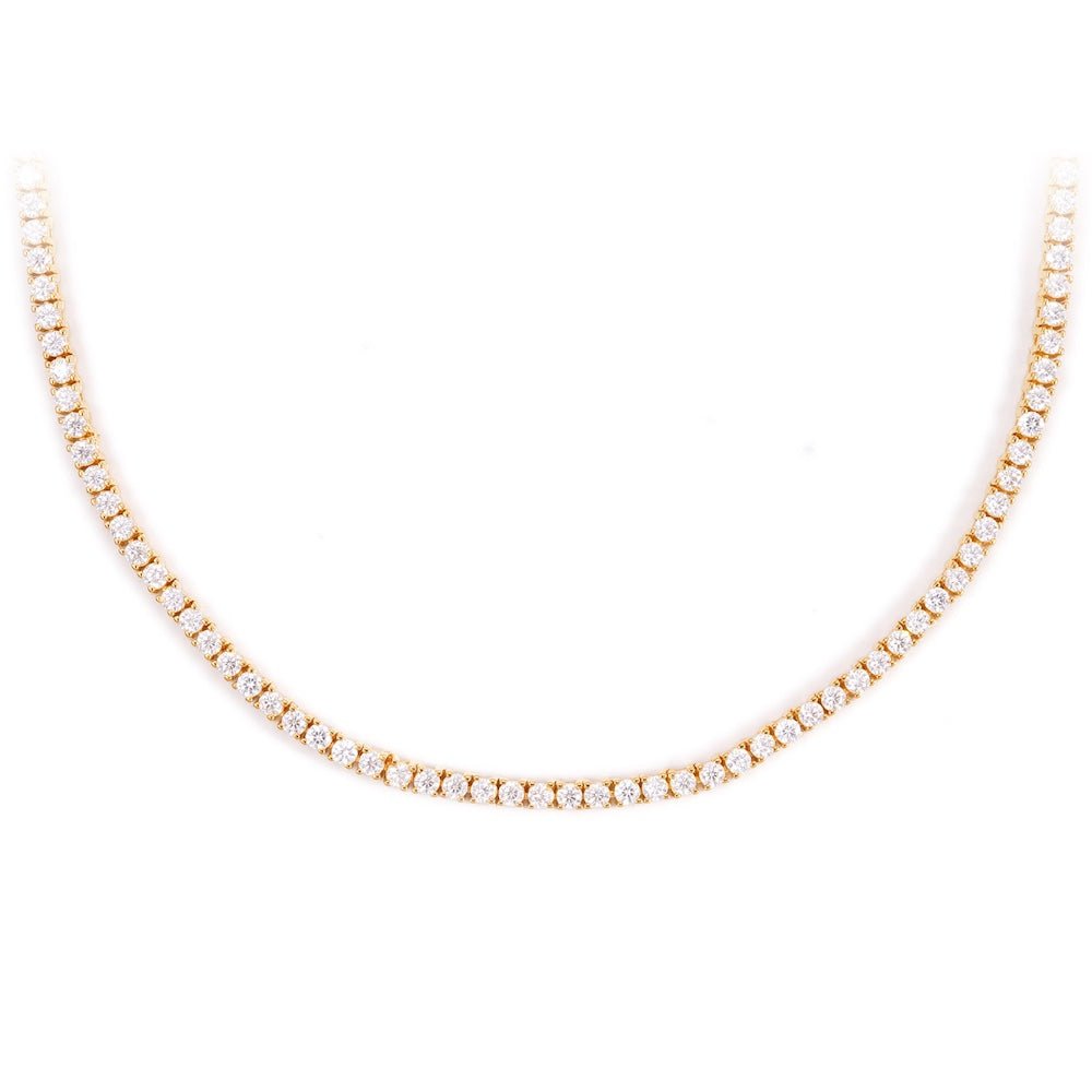 This diamond tennis chain is iced out with round cut, colorless (D-Color), VVS flawless lab diamonds, placed in a prong diamond setting.