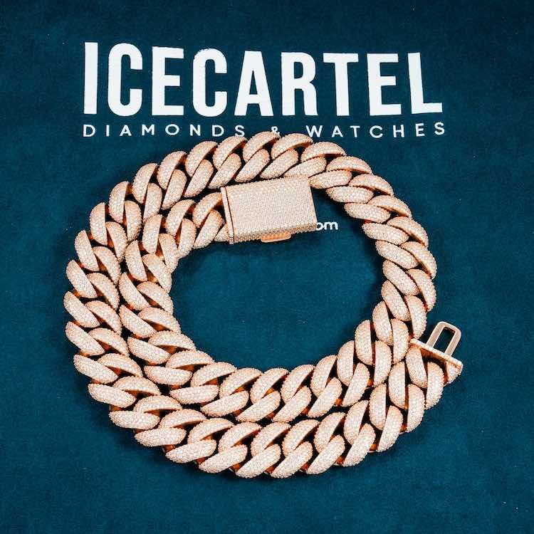 ICECARTEL exclusive 5-Row 20MM Round Cut Moissanite Cuban Link Chain 14K Gold is now available, made of 925 sterling silver and PVD plated with a thick layer of 14K Gold.