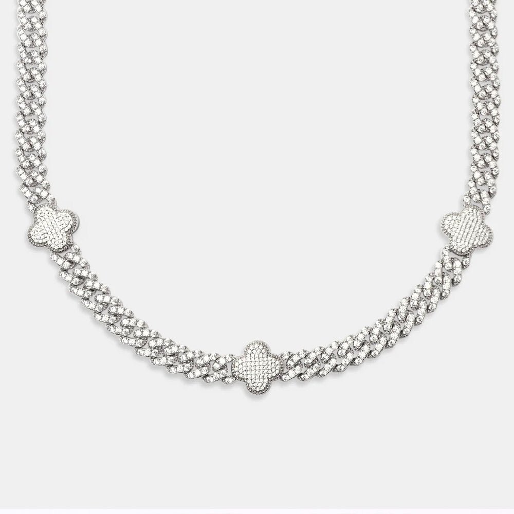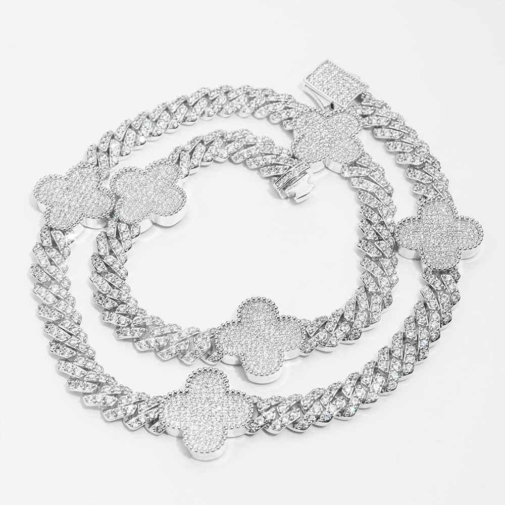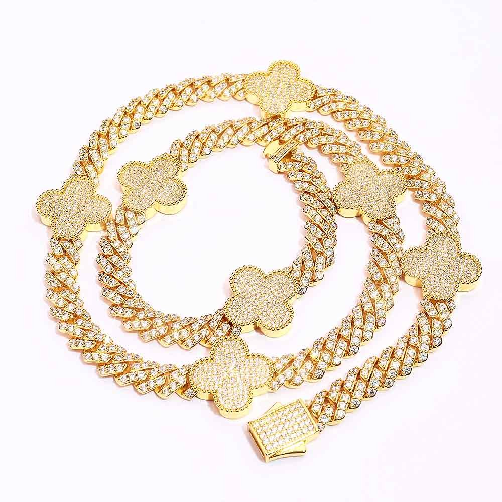 This 8MM Four Leaf Moissanite Cuban Link Chain is made with a base of 925 silver and PVD plated with 14K Gold. At 20 inches, it weighs 83 grams.