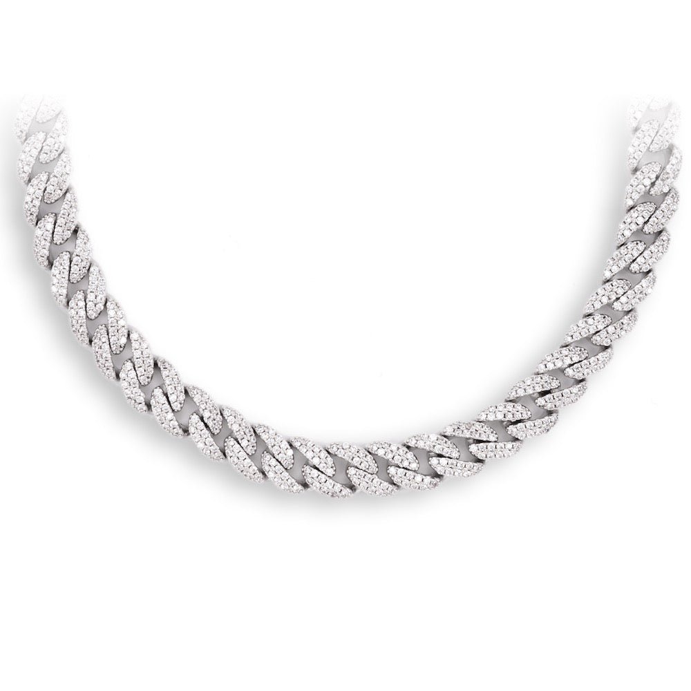 This cuban link chain is iced out with round cut, colorless (D-Color), VVS flawless lab diamonds, placed in a prong diamond setting.