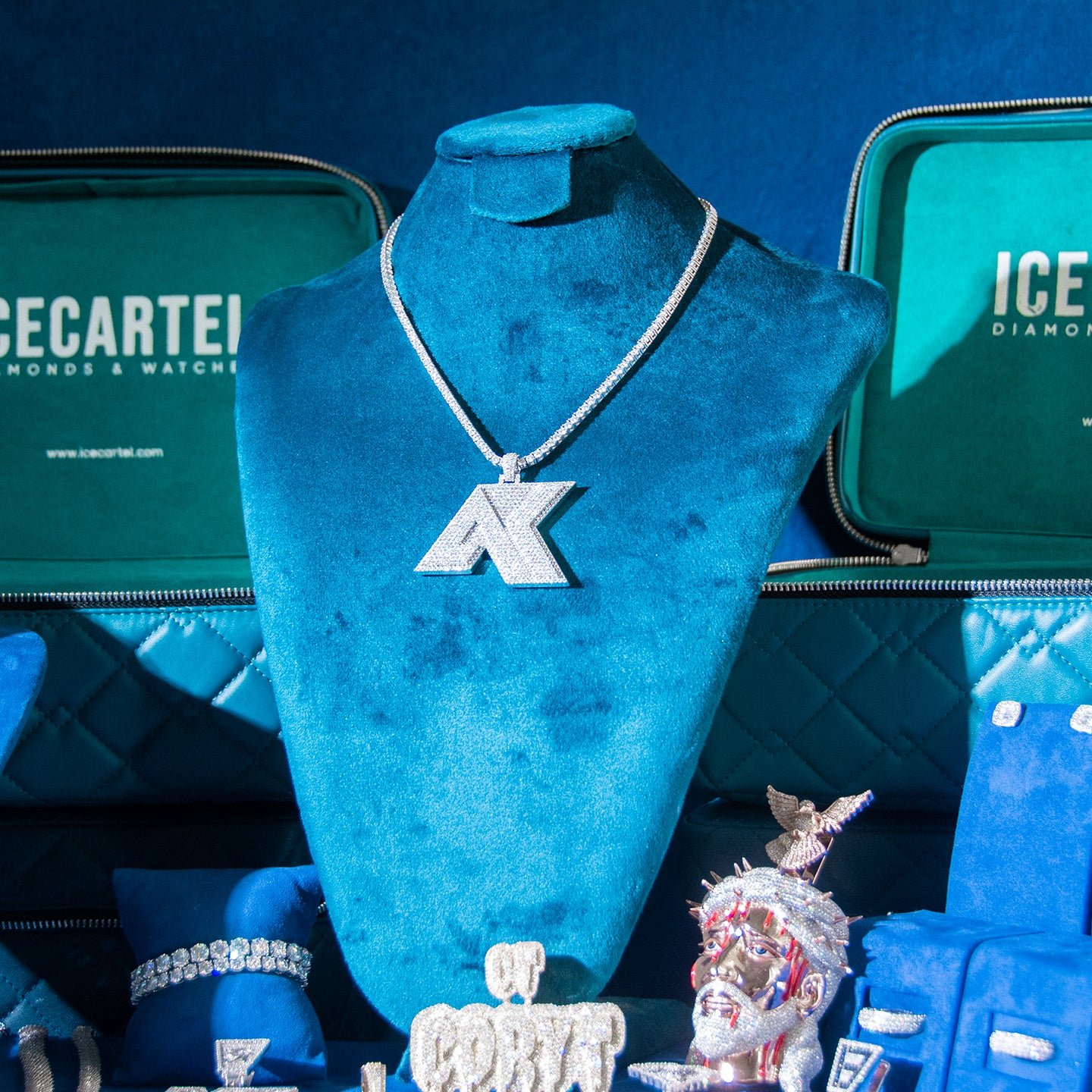 ICECARTEL exclusive “AK” Custom Moissanite Pendant is now available, made with a base of 925 sterling silver and PVD plated with a thick layer of 14K Gold.