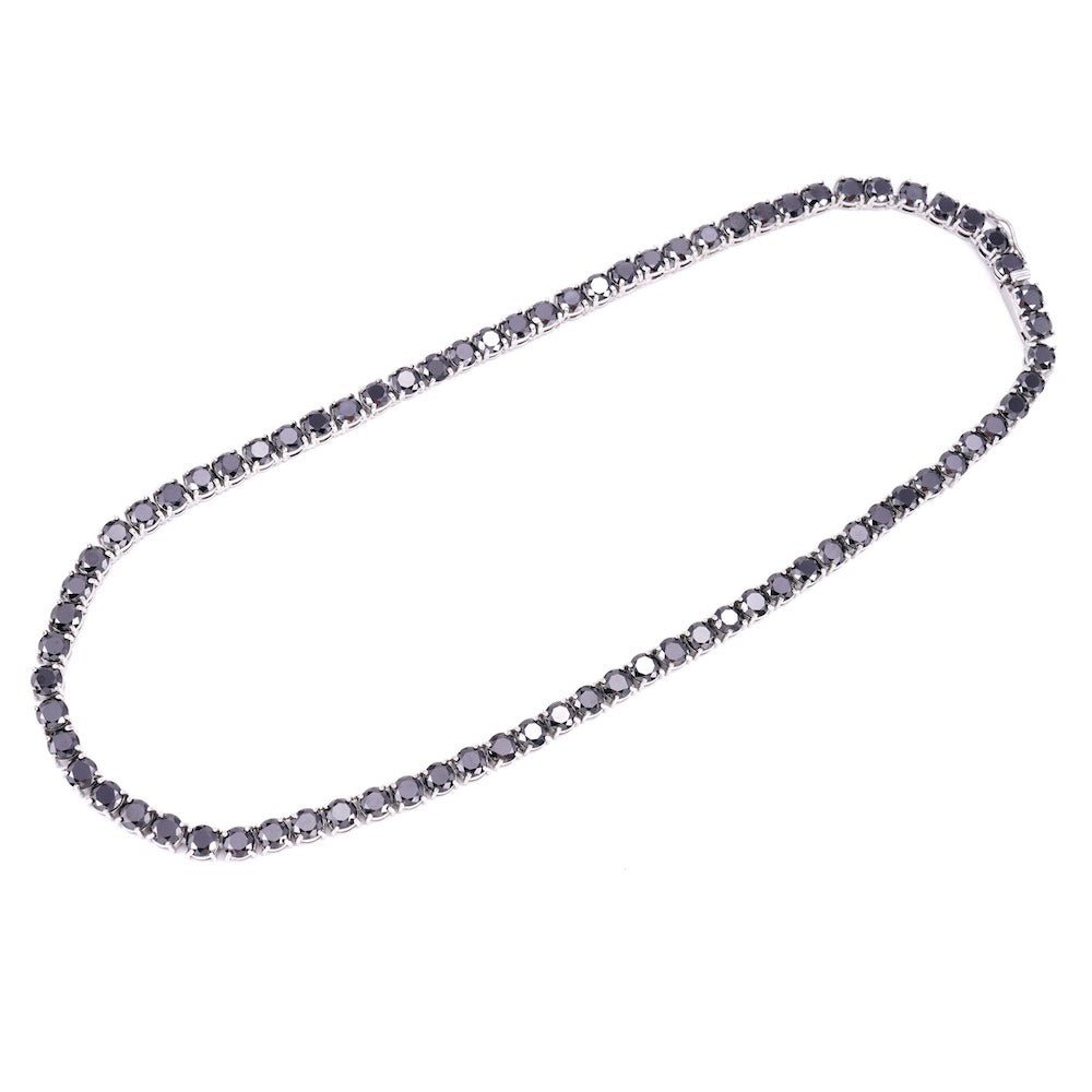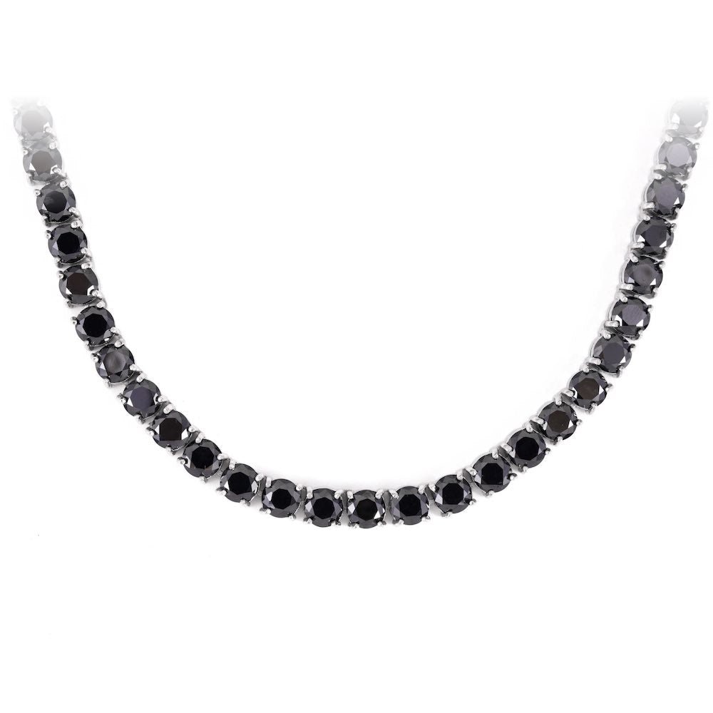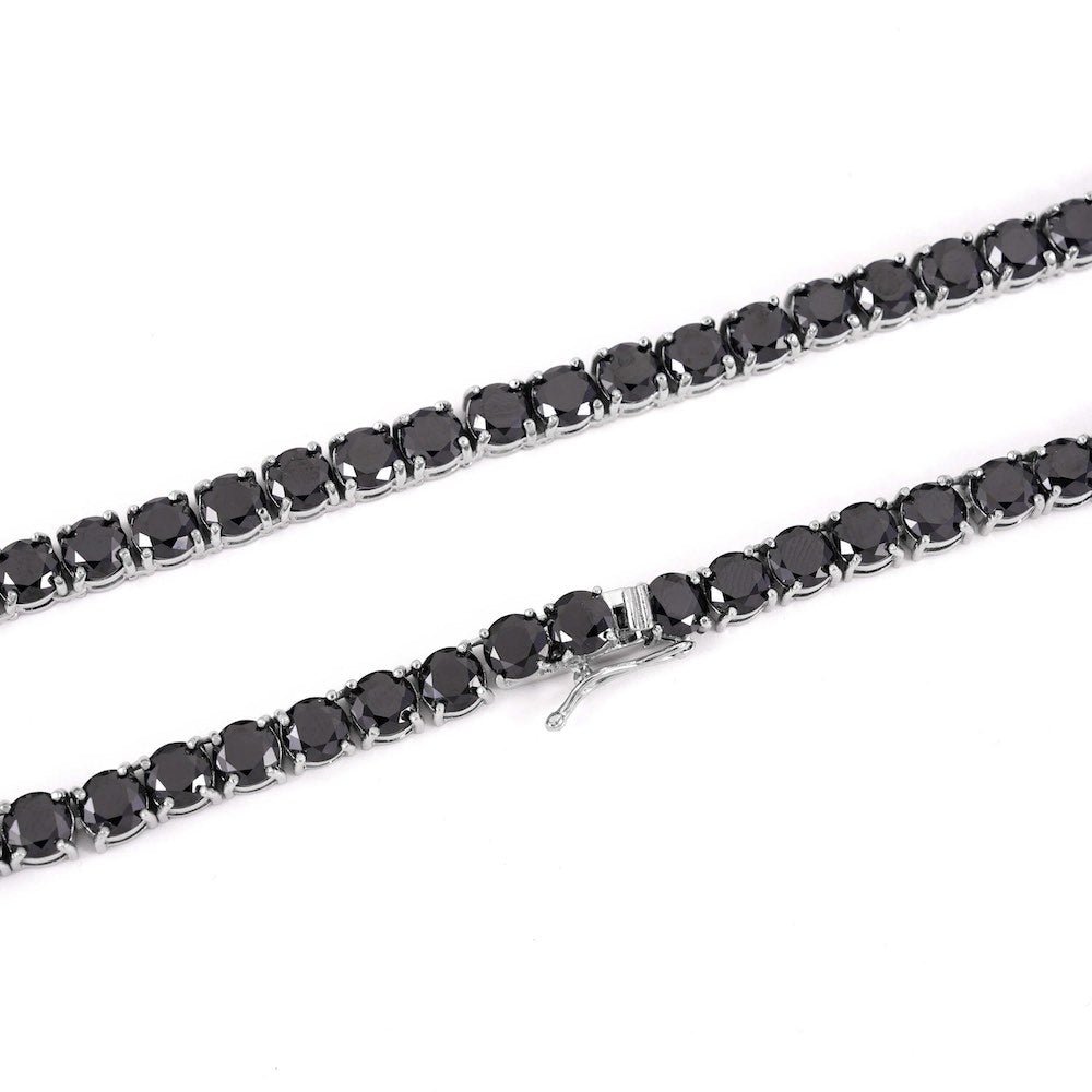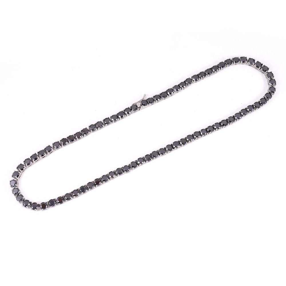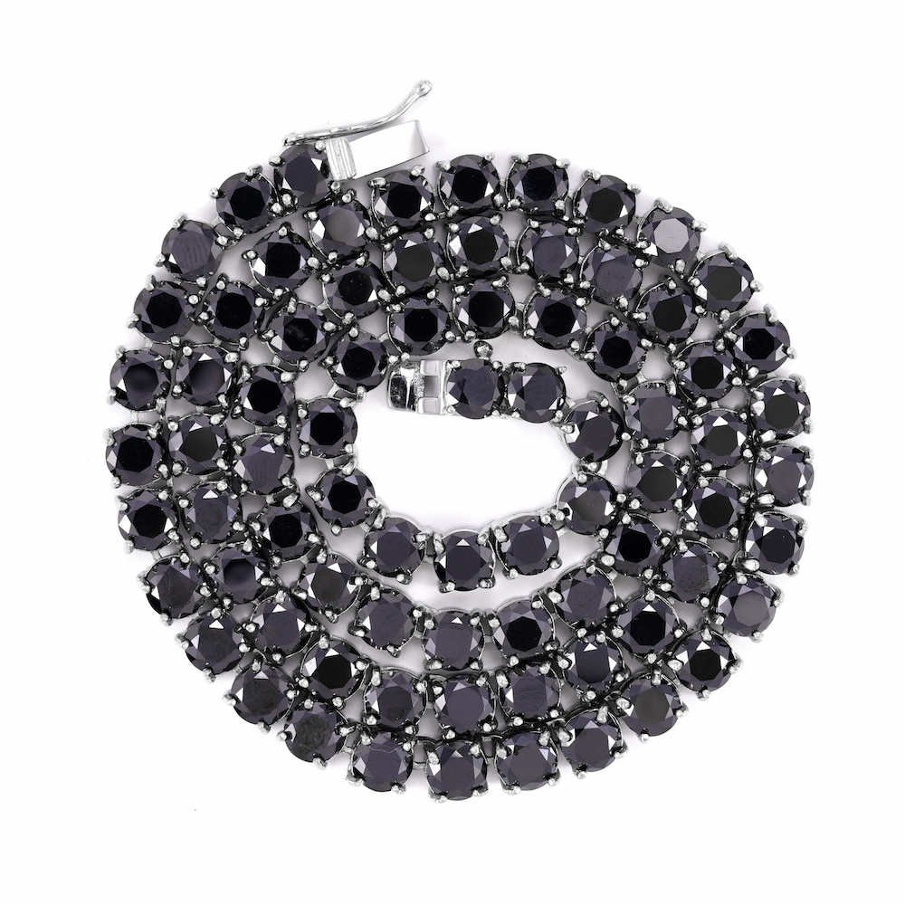 This diamond tennis chain is iced out with black round cut, VVS flawless lab diamonds, placed in a prong diamond setting.
