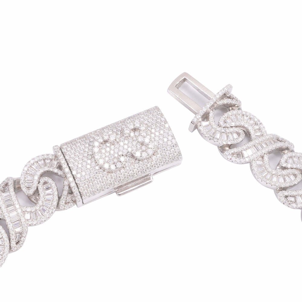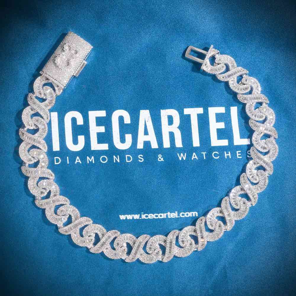 ICECARTEL exclusive 20MM Moissanite Baguette Infinity Link Bracelet 14K Gold is now available, made of 925 sterling silver and PVD plated with a thick layer of 14K Gold. Each link on this moissanite infinity link bracelet measures exactly 20 millimeters in diameter.