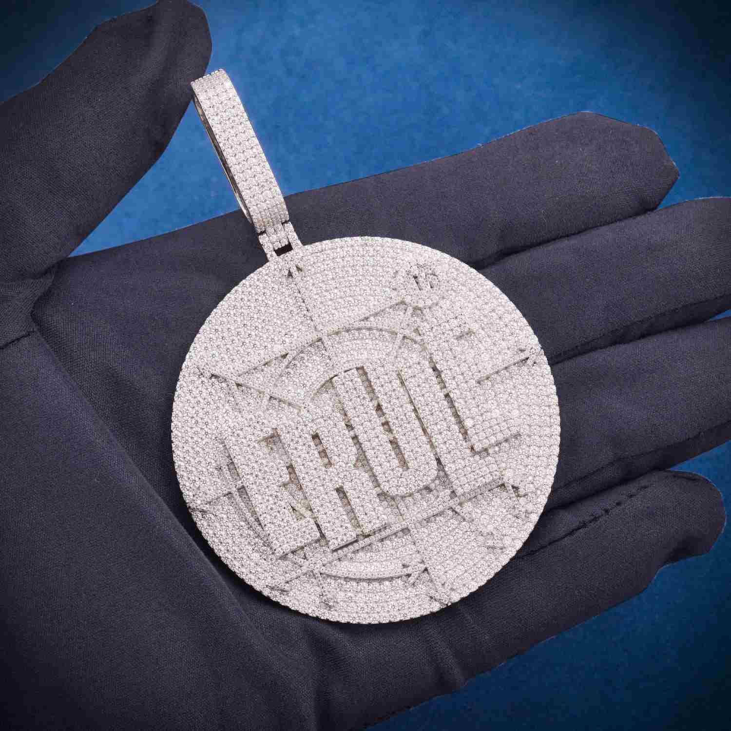 The total weight of this customized pendant starts from 108.5 grams (4 letters), however, the exact weight will vary depending on the Size. The bezel of this custom design moissanite pendant measures approximately