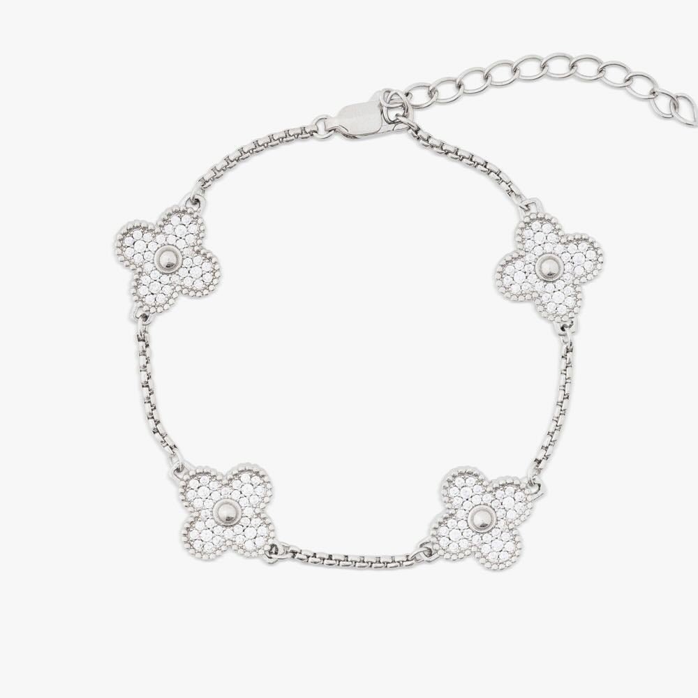 This Four Leaf White Gold Moissanite Motif Bracelet is made with a base of 925 silver and PVD plated with 14K Gold.