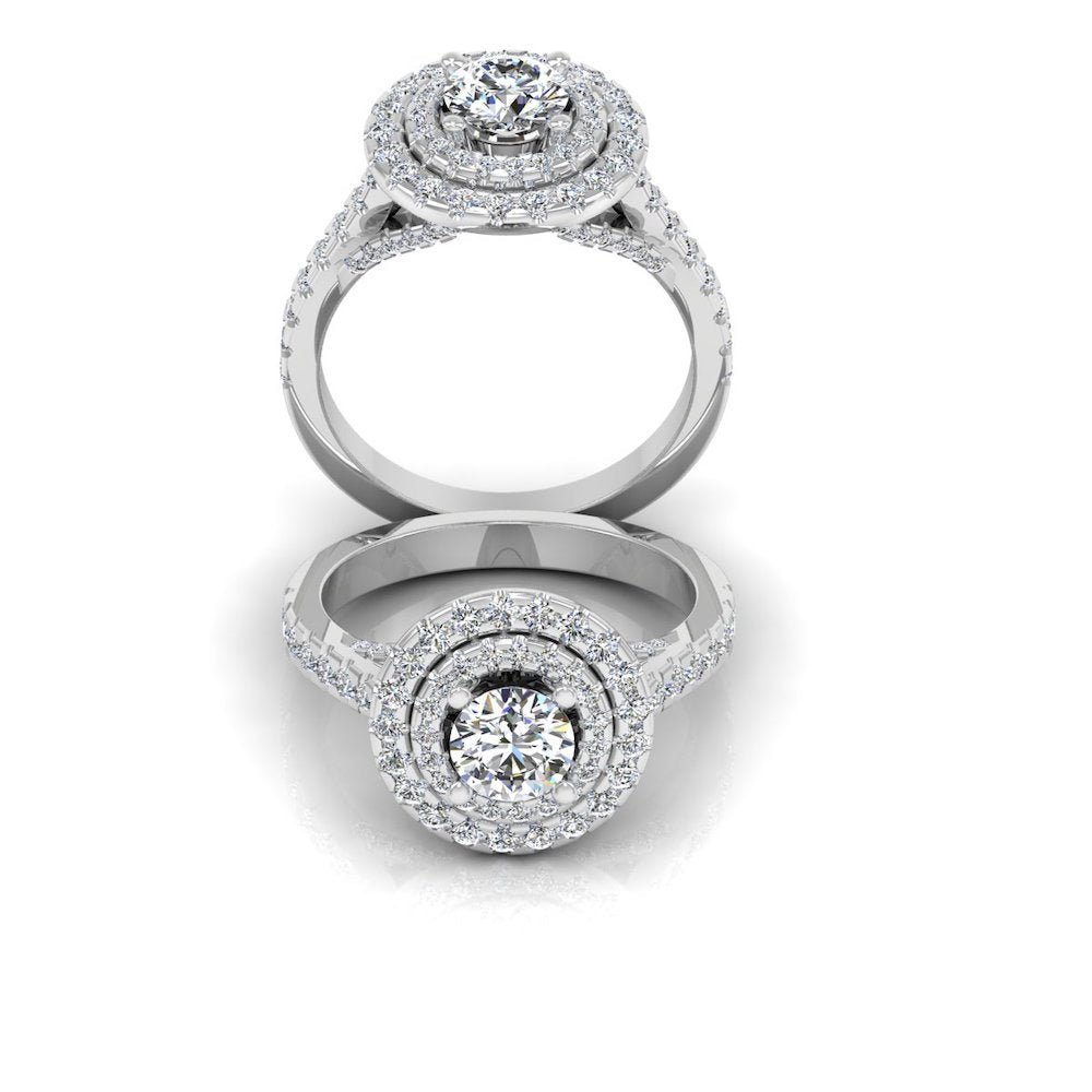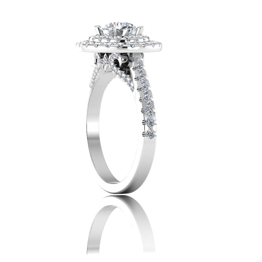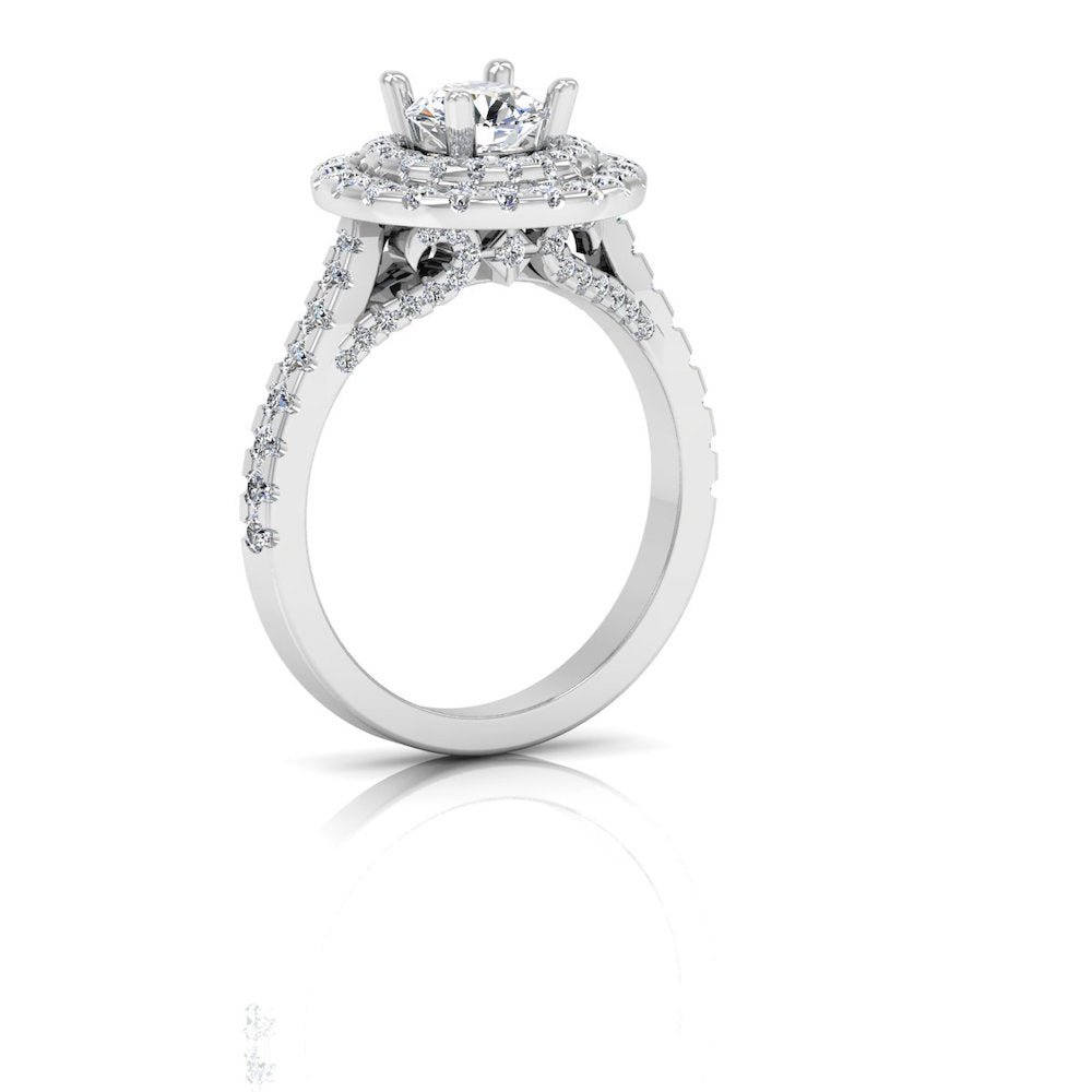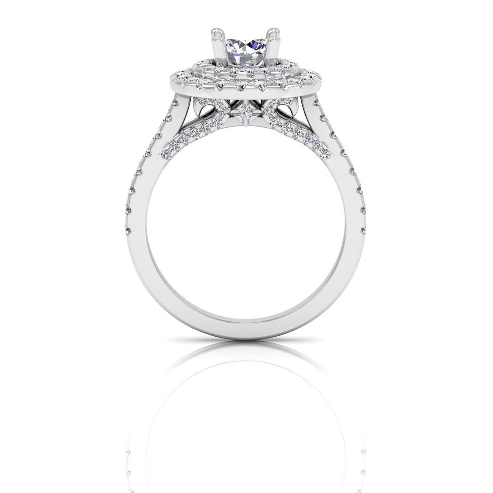 This Twisted Moissanite Engagement Ring has a gold weight of 7.37 grams for 14k gold, 8.01 grams for 18k gold, and a moissanite diamond weight of 1.76 CTW. There are 95 moissanite stones on this ring: the center stone measuring 6.28×6.28MM. This stunning Moissanite ring is placed in a double halo and hidden halo diamond setting.