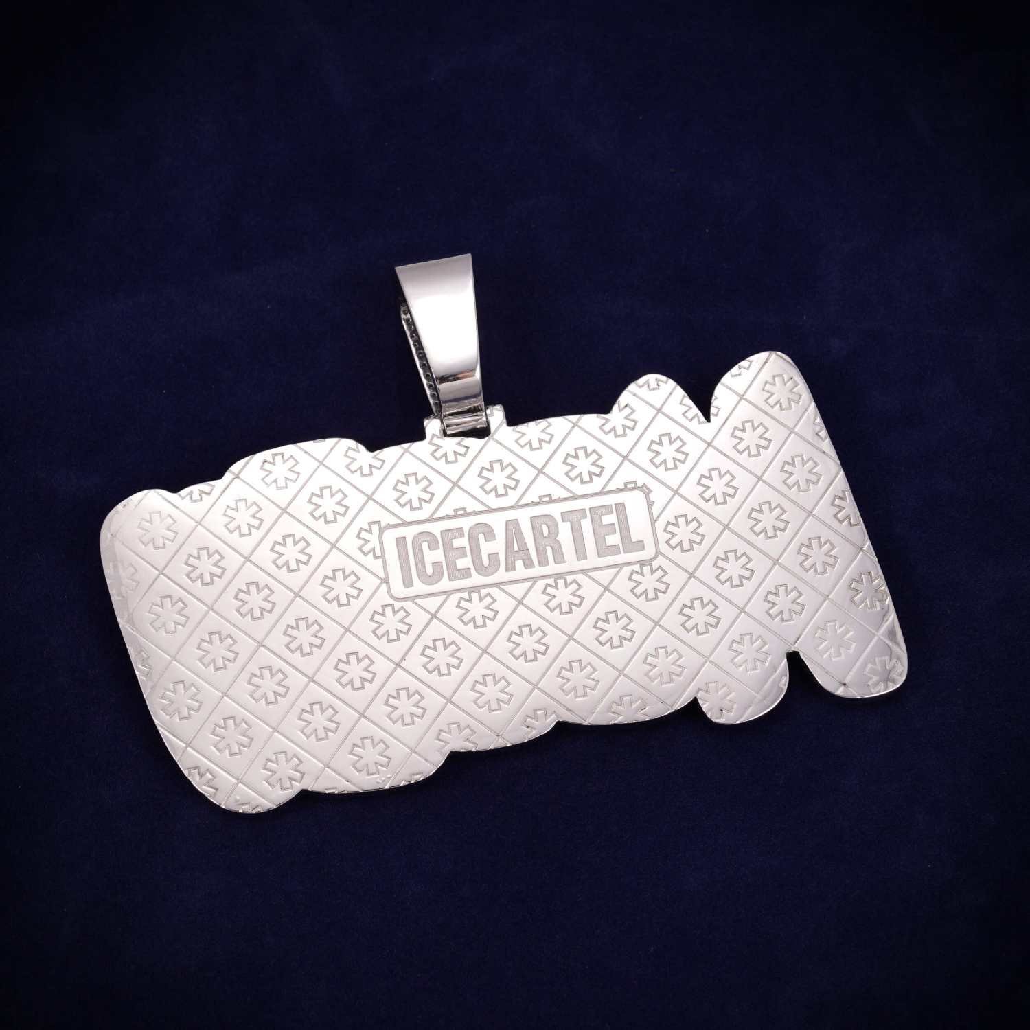 This custom pendant is iced out with VVS moissanite flawless diamonds. All of the diamonds on this custom pendant passes the diamond tester.