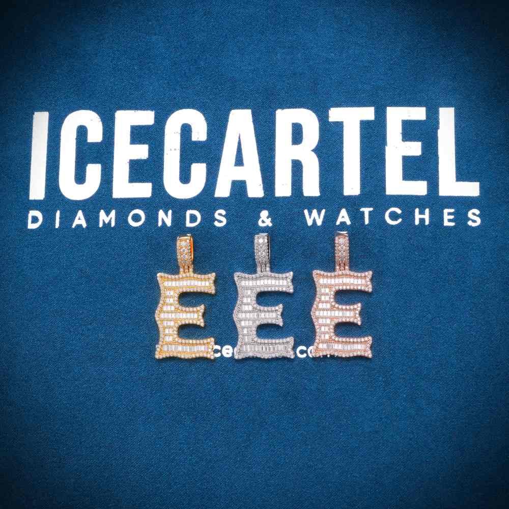 ICECARTEL exclusive Moissanite Baguette Letter “E” Pendant is now available, made of 925 sterling silver and PVD plated with a thick layer of 14K Gold.