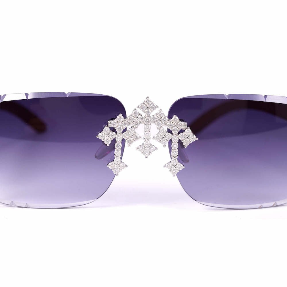 These moissanite sunglasses are iced out with brilliant cut, colorless moissanite diamonds. All of the diamonds on these moissanite diamond sunglasses pass the diamond tester.