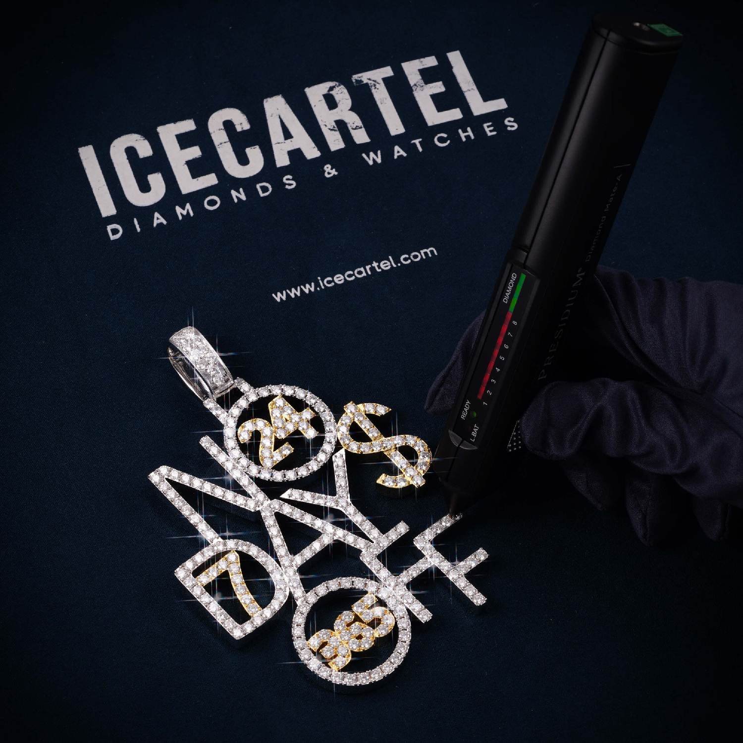 ICECARTEL exclusive “NO DAYS OFF” Custom Name Moissanite Pendant is now available, made with a base of 925 sterling silver and PVD plated with a thick layer of 14K Gold.