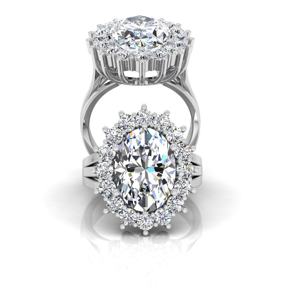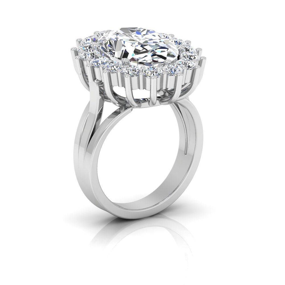 This Double Layer Brilliant Cut Moissanite Engagement Ring has a gold weight of 4.8 grams for 14k gold, 5.12 grams for 18k gold, and a moissanite diamond weight of 7.43 CTW. There are 17 moissanite stones on this ring, the center stone measuring 14.20×10.30MM and the stones on the halo setting measure 2.90×2.90MM each.