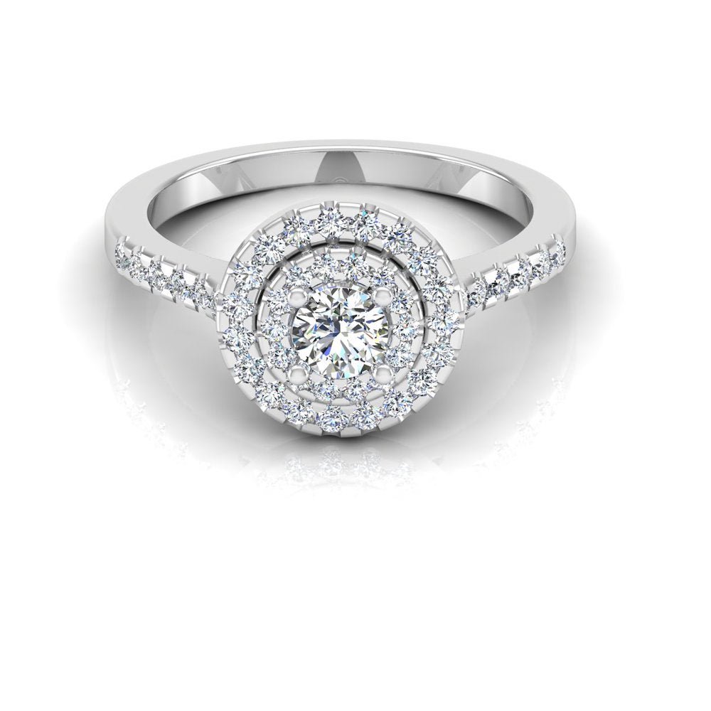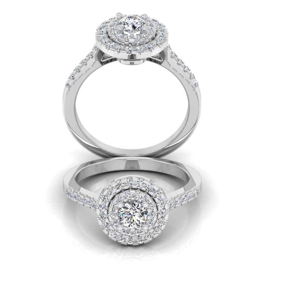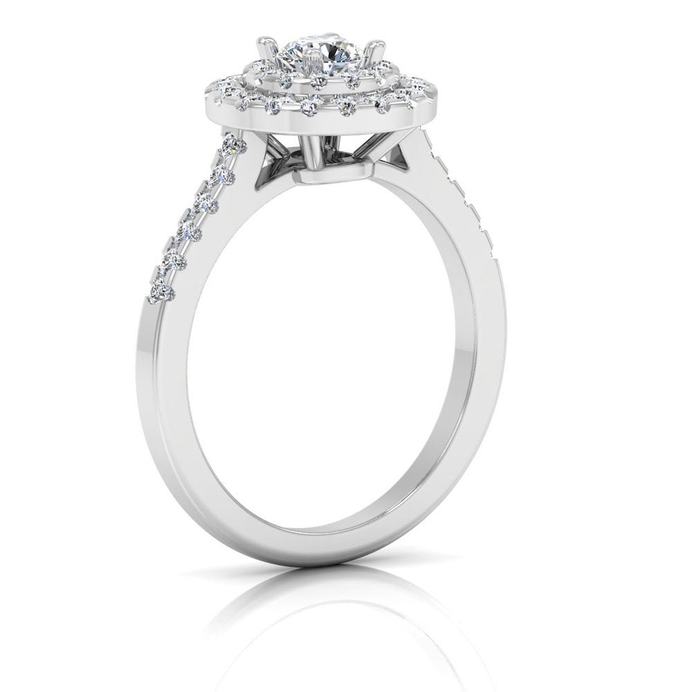 This Round Brilliant Rectangle Halo Moissanite Engagement Ring has a gold weight of 5.29 grams for 14k gold, 5.65 grams for 18k gold, and a moissanite diamond weight of 0.75 CTW. There are 46 moissanite stones on this ring: the center stone measuring 4.3×4.3MM. The diamonds are set in a double halo diamond setting. Round cut stones symbolize commitment.